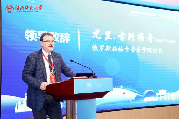 开幕式之后,论坛举行主旨发言。由湖南师范大学音乐学院副院长夏雄军主持,多位专家学者围绕论坛主题作专题报告。首都师范大学音乐学院院长蔡梦以“以经典实施美育·以美育传播经典”为题,探讨经典资源与美育实践的融合路径。俄罗斯格林卡音乐学院校长尤里·古列维奇介绍“俄罗斯格林卡音乐学院的传承与新程”,展现俄方音乐教育传统与发展新貌。东北师范大学音乐学院院长刘欣聚焦AI艺术与美育,探析人工智能时代艺术教育的创新方向。华南师范大学音乐学院院长孔义龙阐述人工智能时代高校音乐学科服务基础教育的使命。安徽师范大学音乐学院院长汪海元分享音乐学科对标建设的实践经验。湖南师范大学音乐学院教授杨和平以“互通、互融、互鉴”为题,总结中俄音乐学院合作办学的人才培养模式与成果。